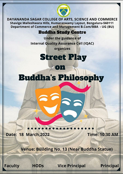 Buddha Study Centre, department of BBA & B.Com, conducted a Street Play titled “Buddha’s Philosophy” on 18th March 2022 from 10:30 am to 10:45 am. The skit was centred the basic doctrines of early Buddhism, which remain common to all Buddhism, include the four noble truths: